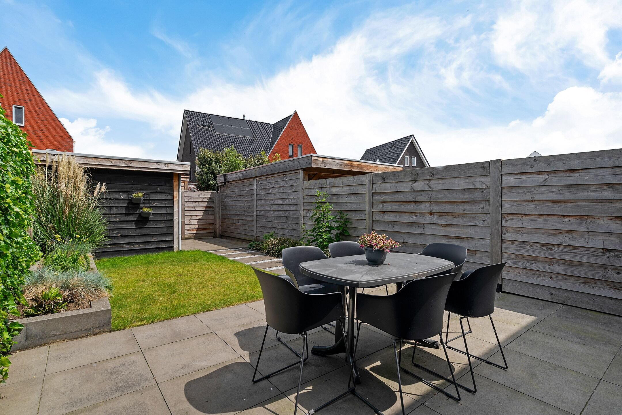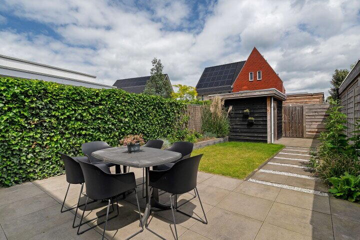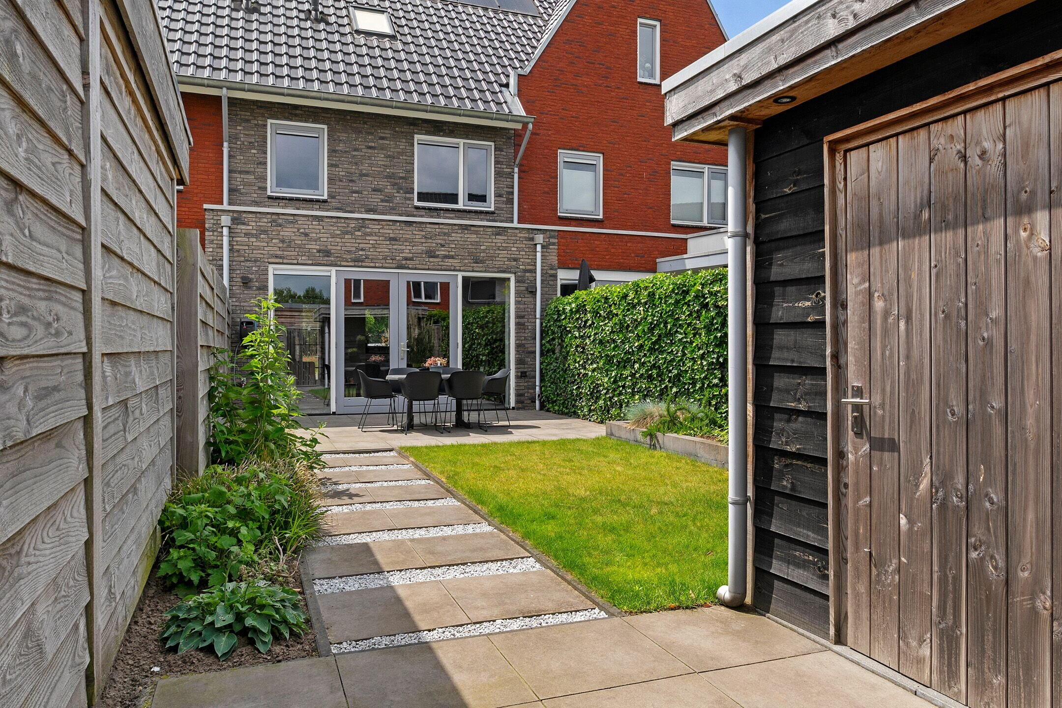 De achtertuin is ruim en fraai aangelegd, achter in de tuin staat een houten berging van 9 m² en een achteringang met pad naar de straat.